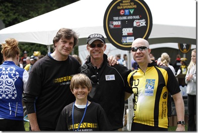 At some point I decided to go to the bathroom. The line to the porta-potties was long but a kind volunteer holding a Starbucks coffee cup mentioned there was a Starbucks not more than a block away. So, I put down my bike and proceeded in the direction of the Starbucks to accomplish two very important tasks: use a bathroom quickly and purchase and consume a split-shot, venti, non-fat latte. After I got back from Starbucks I ran into Damon and Tim (co-workers from Fred Hutchinson Cancer Research Center) and Tim’s wife, Nancy. The four of us are pictured below right before the start (from left to right: me, Damon, Tim, and Nancy).